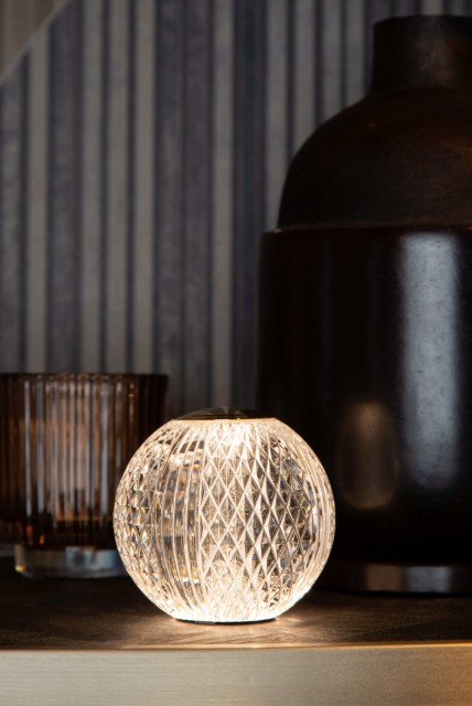 Med riktig stemningsbelysning bringer du et glimt av glede inn i hjemmet ditt hele året. Cintra skaper enkelt opptil 32 timers lysglede hvor du vil. Flytt denne skumringslampen med batteri enkelt inn i hjemmet ditt og gi den en plass på spisebordet eller salongbordet, kommoden eller nattbordet. Den gjennomsiktige kulen inneholder lekne riller som minner om krystall. Demp den integrerte LED-pæren for maksimal atmosfære. Cintra har en diameter på 11 centimeter. Kombiner denne bordlampen med messingtilbehør og gi et ekstra snev av hygge til interiøret ditt. Håndbok: https://www.lucide.com/ftp/manual/13599-02-60_manual.pdf
