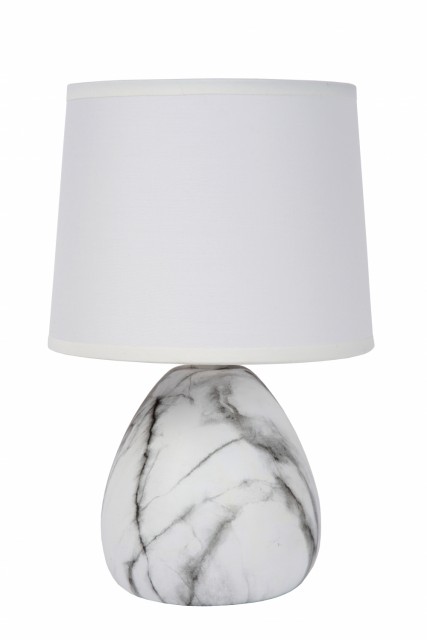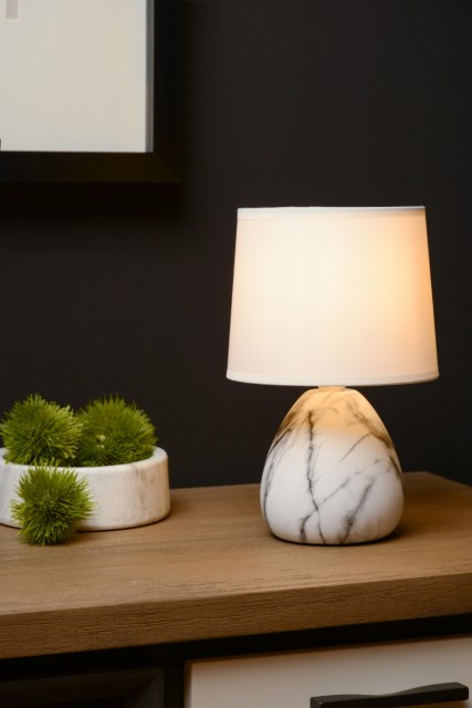 Tidløs og elegant. Med et marmorutseende gir du umiddelbart interiøret ditt den ekstra oppmerksomheten. Du får samme effekt med denne keramiske bordlampen. Linskjermen fanger lyset og skaper en leken glød på de mørke fibrene på benet. På et bord, kommode, skrivebord eller åpent veggskap stjeler Marmo showet i ethvert interiør. Den kan slås av og på på et blunk med en bryter på ledningen. Til tross for sin beskjedne størrelse på 26 centimeter høy og en kropp på 16 centimeter bred, bringer Marmo den nødvendige storheten inn i hjemmet ditt. Håndbok: https://www.lucide.com/ftp/manual/78598-01-30_manual.pdf