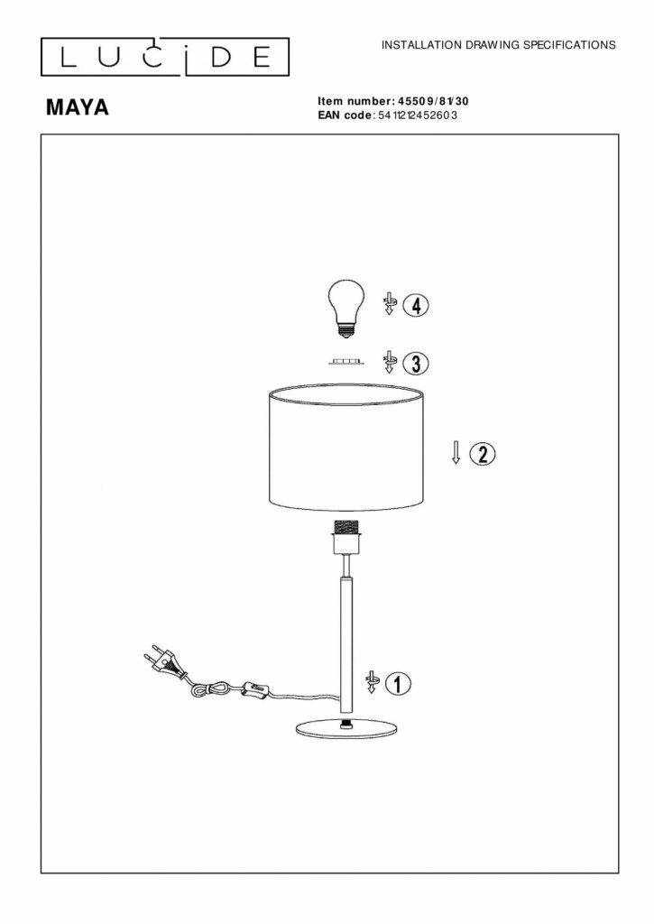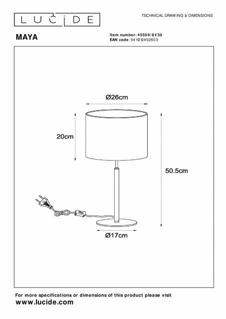 Liker du klassisk omgivelsesbelysning? Da er Maya den perfekte bordlampen for deg. Den slanke basen flyter sømløst inn i en stilig lampeskjerm i bomull som kaster en koselig glød over stuen eller soverommet. Med en høyde på 50 centimeter og en diameter på 26 centimeter er Maya den perfekte lesefølgesvennen ved siden av sofaen eller på skrivebordet. Komplett med en stilig stoffkabel på 180 centimeter, gir Maya deg fleksibiliteten til å plassere den hvor du vil. Håndbok: https://www.lucide.com/ftp/manual/79177-06-31_manual.pdf