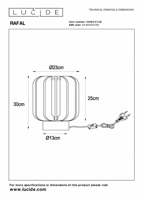 Vintage med en overraskende vri: møt Rafal. De forskjellige filtstripene som går over lampen skaper et spennende samspill mellom lys og skygge, noe som gjør den til et fengslende stykke. Rafal er mer enn bare en lyskilde - det er et fascinerende statement-stykke som vil gi personlighet til stuen eller soverommet ditt. Med en høyde på 31 centimeter og en diameter på 23 centimeter passer Rafal perfekt i bokhyllen, skjenken eller nattbordet. Den 180 centimeter lange stoffkabelen gir deg fleksibiliteten til å plassere denne bemerkelsesverdige bordlampen hvor du vil. Håndbok: https://www.lucide.com/ftp/manual/79158-01-31_manual.pdf