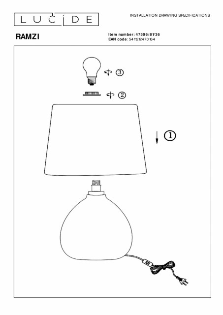 Beroligende farger, naturlige materialer og en elegant form kommer sammen i denne kompakte bordlampen. Med en høyde på 26 centimeter kan denne lampen kalt Ramzi pryde ethvert bord. Du kan bruke den som stemningsfull belysning i tillegg til TV-en eller som leselampe om natten, siden lyset er jevnt fordelt over og under. Du nyter et landlig design laget av eksklusiv keramikk. Du kan slå Ramzi av og på med en bryter i ledningen. Tilgjengelig i flere farger. Håndbok: https://www.lucide.com/ftp/manual/79110-35-30_manual.pdf
