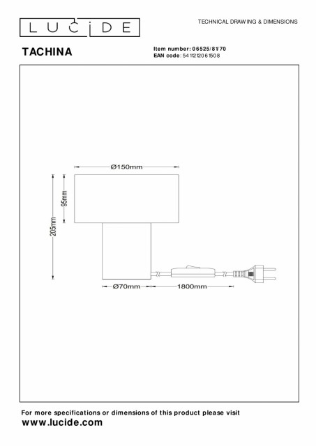 Legg til et snev av moderne eleganse til skrivebordet, sidebordet eller nattbordet med Tachina. Denne stilige bordlampen har en sylindrisk trefot toppet med en raffinert lampeskjerm i lin. Resultatet? Et varmt, diffust lys som bader rommet ditt i en intim atmosfære. Tachina vil sette det spesielle preget på stuen, kontoret eller soverommet. Med en praktisk bryter på ledningen og kompatibilitet med energisparende LED-pærer, setter Tachina stemningen når du trenger det. Klar for en stiloppgradering? Håndbok: https://www.lucide.com/ftp/manual/06525-81-70_manual.pdf