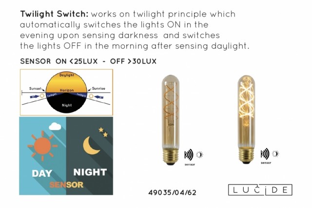 Lucide Twilight Sensor LED-glødelampe er løsningen for alle som ønsker å konvertere sin nåværende elskede utendørslampe til en versjon med dag/natt-bytte. Pæren er utstyrt med en innebygd lyssensorbryter. Denne lux-sensoren, eller dag/natt-bryteren, slår lampen på automatisk om kvelden, og slår den av igjen om morgenen. Utendørslampen eller hagelampen din har også et unikt utseende på grunn av det ravfargede glasset og den synlige spiralglødetråden til denne LED-lyspæren. Det ekstra varme hvite og diffuse lyset skaper funksjonelt stemningsfullt lys ved inngangen til hjemmet ditt og skaper den perfekte stemningen i hagen din. Praktisk, energibesparende og dermed også bra for lommeboken og miljøet! Sensoren er forhåndsprogrammert basert på følgende lysstyrker: Ved skumring under 25 lux slås lyskilden på, og i dagslys over 30 lux slår den seg automatisk av igjen. Håndbok: https://www.lucide.com/ftp/manual/78174-40-33_manual.pdf