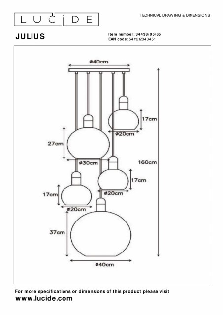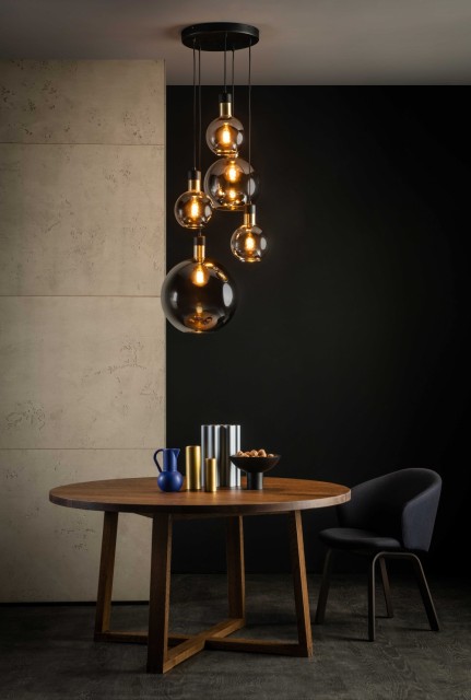 Kan interiøret ditt håndtere litt mer? Da er pendellampe Julius riktig for deg. Med hele fem glasskuler med lys kan den fungere veldig godt som et vintage blikkfang i hjemmet ditt. Glasskulene av lys, med en fumé-finish for et enda sterkere utseende, dingler i forskjellige høyder på den fine tekstilsnoren. Alt du trenger å gjøre er å henge dem i ønsket lengde - opptil halvannen meter - og feste den kompakte monteringsplaten i taket. Går du for den ultimate stemningsskaperen i huset ditt? Koble deretter lysarmaturen til en dimmer (ikke inkludert). Julius er kompatibel med LED-pærer. Håndbok: https://www.lucide.com/ftp/manual/79185-50-02_manual.pdf