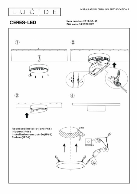 En baderomslampe skal være funksjonell, vanntett og vakker. Som Ceres, med sitt integrerte LED-lys. Den enkle, organiske formen gir ro til morgen- og kveldsritualet ditt. Du kan enkelt feste den innfelte taklampen i taket som monterbart lys med et rent resultat. Ceres er spesialdesignet for sikker og langvarig bruk på badet. I tillegg kan du enkelt koble den til en dimmer. Romantisk bading? Sjekk! Håndbok: https://www.lucide.com/ftp/manual/79199-32-61_manual.pdf