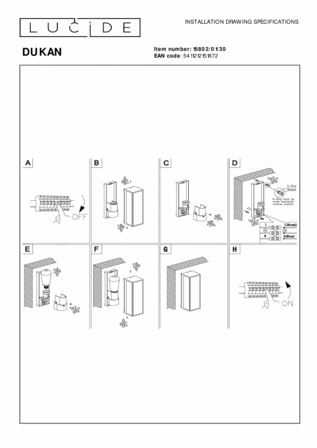 Dukan passer rett inn i et museum: én lyskilde i en stilig svart ramme. Denne vegglampen er egnet for langvarig og pålitelig utendørs bruk. Designet er laget av eksklusivt glass og en rektangulær stålramme på 25,8 x 8,6 centimeter. Med sitt stramme utseende passer vegglampen perfekt til en moderne fasade. Takket være den tidløse designen føler denne utendørslampen seg også hjemme i et klassisk hjem. Kombiner den monterte LED-en og sett umiddelbart stemningen for hver besøkende som ringer på døren. Ved hjelp av en slank monteringsplate kan du enkelt feste vegglampen til fasaden. Dukan kobles også enkelt til en dimmer. Håndbok: https://www.lucide.com/ftp/manual/15802-01-30_manual.pdf