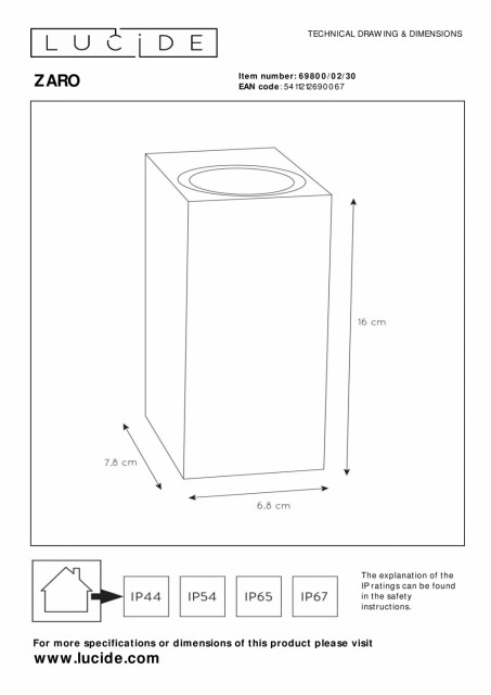 Vil du ha flere? Sikkert. Denne veggspotlighten, kalt Zaro, er 16 centimeter høy. Det gjør ham til den store gutten i denne samlingen av moderne utendørsbelysning. Aluminiumsstangen er lett og ser slik ut. Ikke et robust utseende, men en spenstig karakter. Den underliggende teknologien er spesielt designet med tanke på langvarig utendørs bruk, vær og vind. Zaro er kompatibel med en LED-pære og kan monteres på et blunk. Klar til å nyte hagen din? Håndbok: https://www.lucide.com/ftp/manual/77979-01-02_manual.pdf
