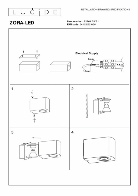 De kompakte, hvite Zora-LED-vegglampene er et moderne valg for å lyse opp stuen eller uteterrassen. Den utskiftbare og medfølgende LED-lyskilden holder seg både innendørs og utendørs. Et elegant, moderne design som er enkelt å koble til en dimmer. Lysstyrken på 3000 K betyr en varm glød av hvitt lys og viser deg veien i mørket. Dette belysningselementet har et moderne og holdbart utseende. Med denne belysningen nyter du stuen eller terrassen på en økologisk ansvarlig måte. Håndbok: https://www.lucide.com/ftp/manual/22861-05-31_manual.pdf