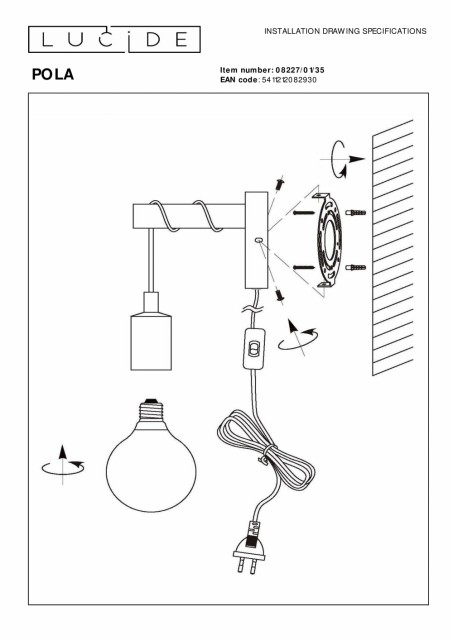 En kjekk vegglampe er uunnværlig i den moderne barnehagen. Dette fungerer ikke bare som nattlampe for de yngste barna, men også som leselampe eller morsomt, dekorativt element for de litt eldre barna. Pola har de unike egenskapene til et fargerikt, tidløst design, kompakte dimensjoner og materialer av høy kvalitet. Du fester ganske enkelt Pola til veggen, setter støpselet inn i stikkontakten og trykker bryteren i ledningen. Du kan gjøre kabelen som lyskilden er festet til så lang eller så kort du vil ved å snu den lekent rundt lysarmaturen. Håndbok: https://www.lucide.com/ftp/manual/08227-01-35_manual.pdf